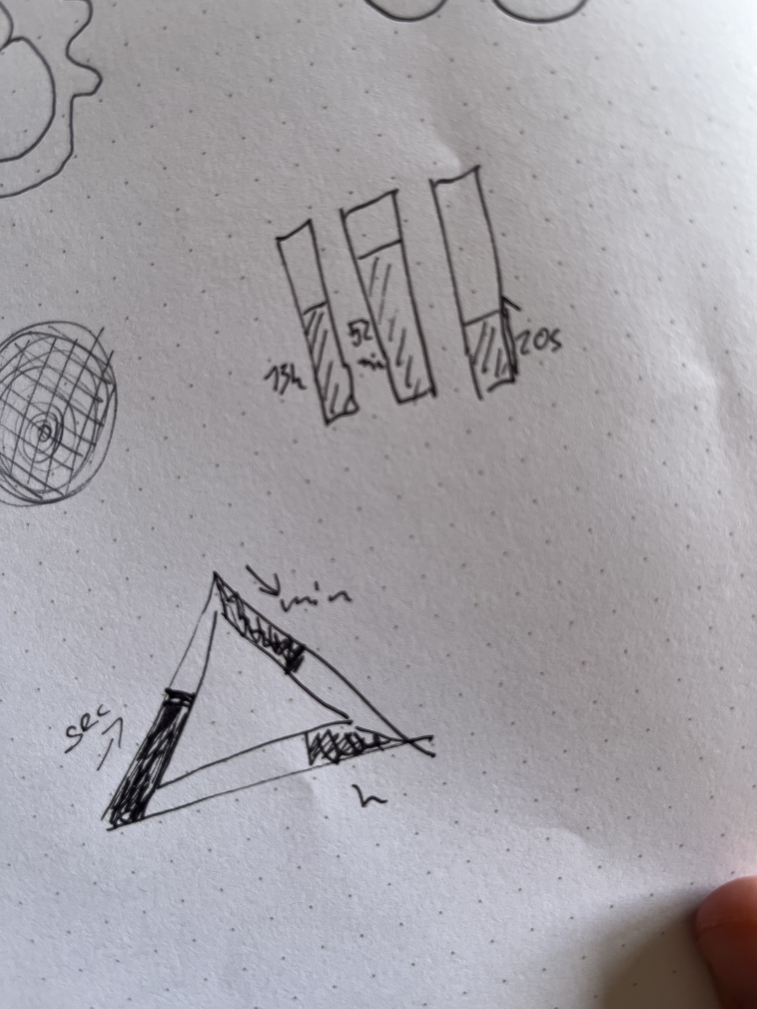 First I wanted to smoothen the movement between seconds so it looked like a linear loading bar, to kinda play around with the way we read time, but then I had the idea to shape the 3 bars into a triangle, so that once a bar is full it kinda just tips over into the next bar. I tried to use the rotate function to rotate the bars but I failed at math I guess.